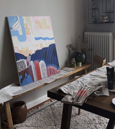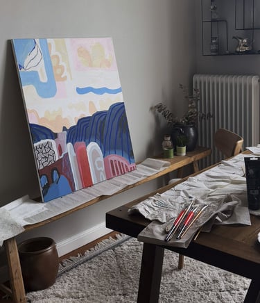 My pieces are expressive and abstract, yet always rooted in a place. A sunset over the Moroccan desert, the silhouette of an island in the Atlantic, an evening in Vasastan. Each one is born from places that have left a mark on me. I don’t only want to depict them; I want to capture the feeling of being there, in that very moment. I paint with bold colors, playfulness, and careless shapes. I believe that to make a brushstroke come alive is not perfect lines or realism, but movement and emotion.